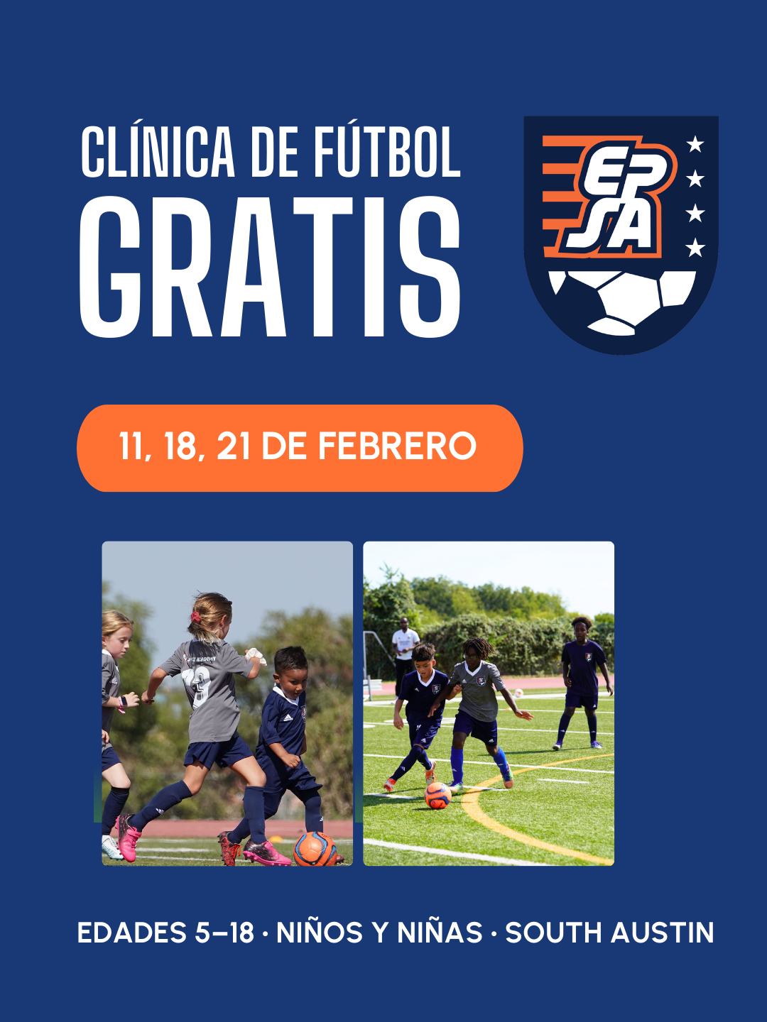 FREE Soccer Clinics • February 11, 18, 21 • Ages 5-18